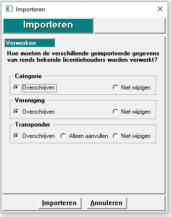 Wanneer je al eerder dit seizoen een licentiebestand hebt ingelezen en opnieuw een licentiebestand inleest als update van de voorgaande licentiebestand. Kun je de keuze maken om niets te wijzigen en alleen maar nieuwe gegevens in te laden. Bij de transponder worden als je op overschrijven klikt alleen eigen ingevoerde transponders overschreven. Je kunt hier ook kiezen om ze alleen aan te vullen, dan zal overal waar nog geen transponder staat een transponder toegevoegd worden.